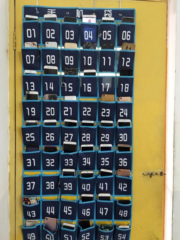 新学期呈现新气象。新学期第一节课,数学与统计学院数学与应用数学1611班、1612班、1711班上课教室的门后悬挂着一个个手机袋,上课前大多数学生主动将手机停入“机位”,让课堂与手机“分离”。