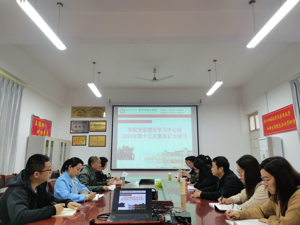 (数学与统计学院 通讯员 耿付荃)11月9日,数学与统计学院举行党委理论学习中心组2023年第十三次集体扩大学习。学院领导、党委委员、党支部书记、各办主任、团委书记、辅导员参加会议。会议由学院党委书记刘浩主持。