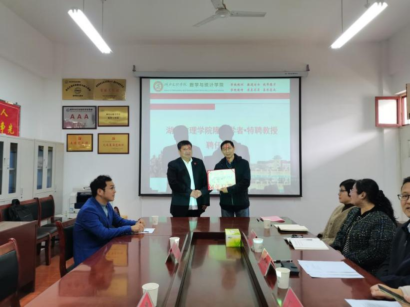 (数学与统计学院 通讯员 吕鹏)2024年11月11日,我校84级杰出校友、天津大学博士生导师黄正海教授,受聘任为我校隆中学者·特聘教授的聘任仪式在学院会议室举行,由数学与统计学院党委书记袁红星主持,校党委常委、副校长曹健出席聘任仪式为黄正海教授颁发聘书并讲话。数学与统计学院领导班子成员及博士教师代表参加了聘任仪式。
