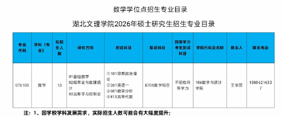 3、2026年湖北文理学院数学与统计学院数学学硕咨询QQ群:622026674,我校将在研究生处网站上及时发布招生相关信息,请考生在报名、初试、复试、录取等阶段上网查询。研究生处网址:http://yjsc.hbuas.edu.cn 。