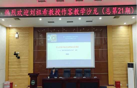 活动由我院育师桥数学教师学习工作室主持人余晓娟博士主持。丁凌院长致欢迎词并介绍了刘祖希教授。沙龙历时三个小时,采用报告中穿插学员分享的形式,就数学教师的成长成才之路,进行了研讨和交流。刘祖希教授创造性提出了以“通识素养、专业素养、教育理论素养、教学实践能力”为主要内容的数学教师核心素养体系。他鼓励青年教师熟读课程标准、强化阅读和写作、参与课题研究、加强同行交流、提炼教学主张。在分享环节,襄阳市一中纪委书记王勇教授和襄阳市三中教研组长邓超群教授分享了他们成才之路上的实践经验和关键因素。襄城区教研员张少艳老师带领的教学团队积极思考,踊跃提问,他们的精妙提问和刘教授的精彩回答将沙龙活动推向了一个又一个高潮。