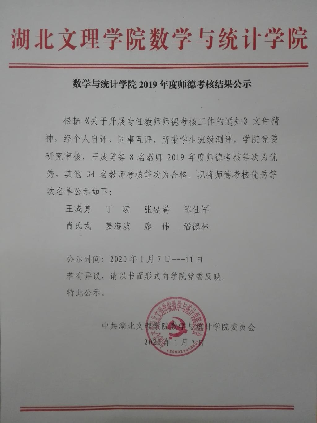 数学与统计学院2019年度师德考核结果公示