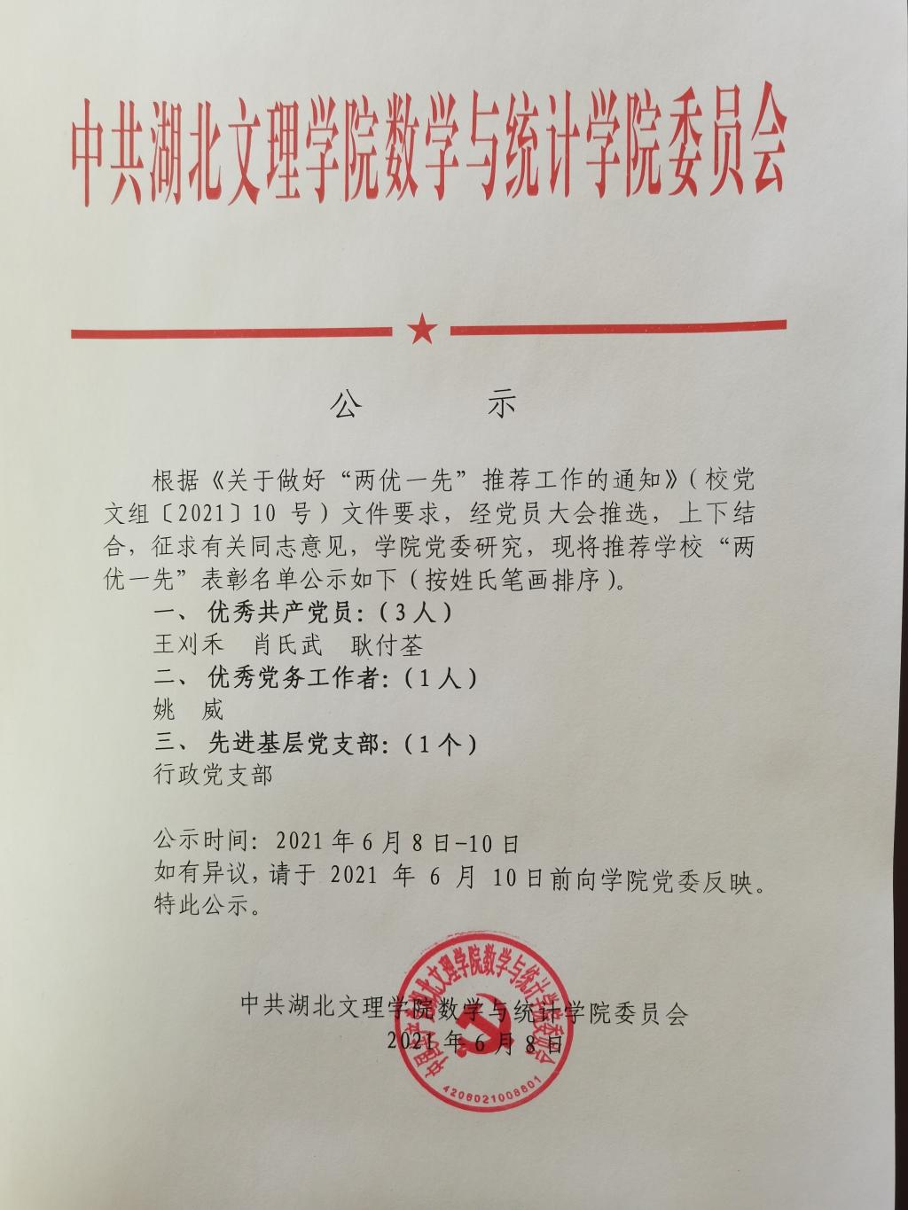 数学与统计学院推荐学校“两优一先”表彰名单公示