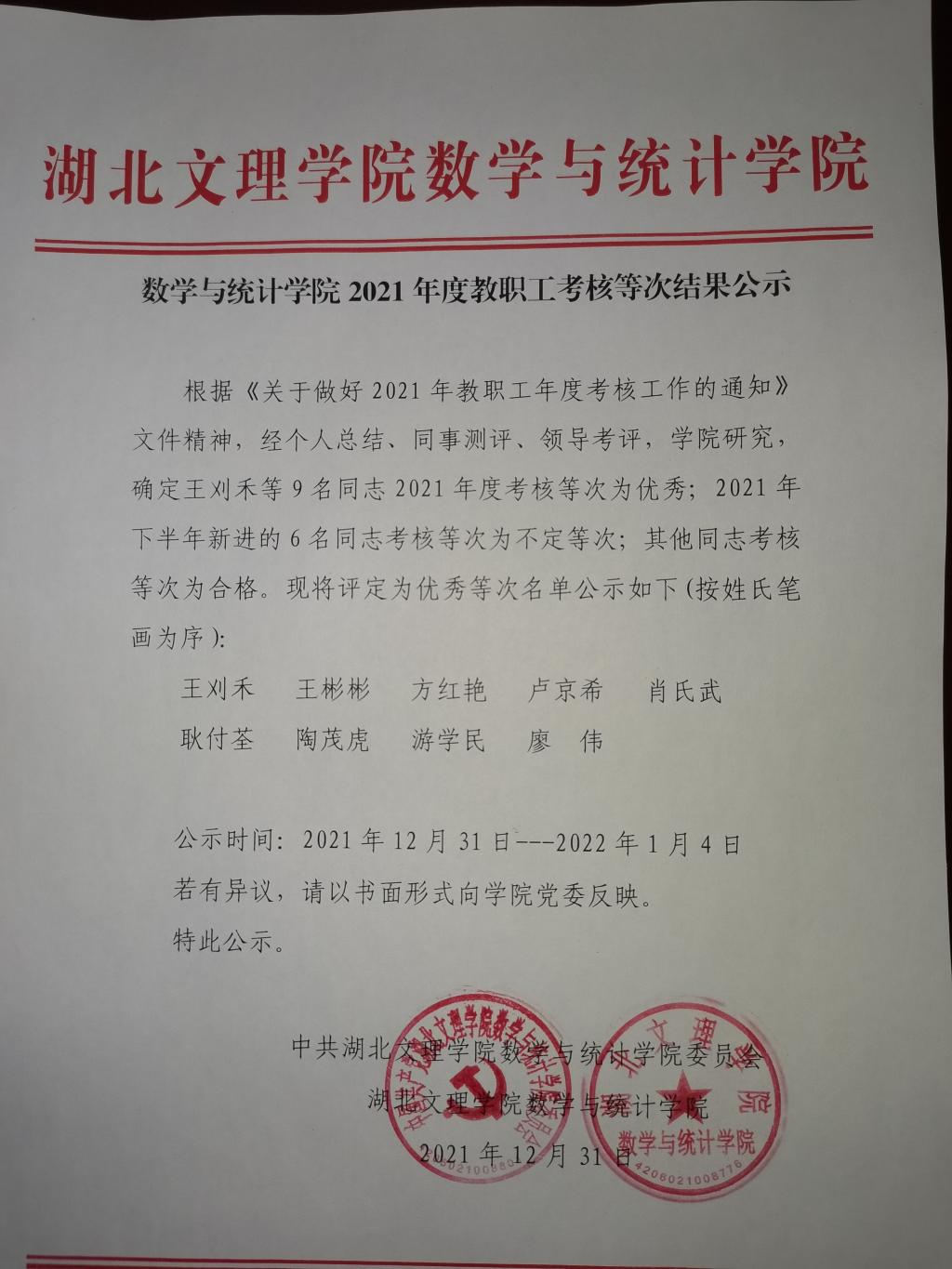 数学与统计学院2021年度教职工考核等次结果公示